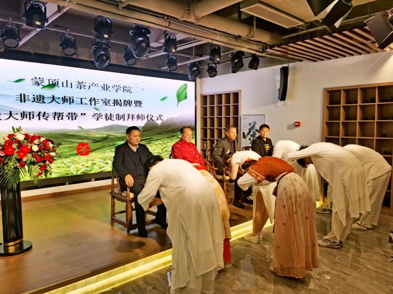 随后举行“非遗大师传帮带”学徒制拜师仪式,由黑茶制作技艺、南路边茶(藏茶)制作技艺国家级非遗传承人甘玉祥;蒙山茶传统制作技艺传承人魏志文;雅安市非物质文化遗产项目南路边茶制作技艺代表性创承人伍仲斌;名山区蒙顶山手工茶非遗传承人高永川组成的“非遗大师”阵容强大。